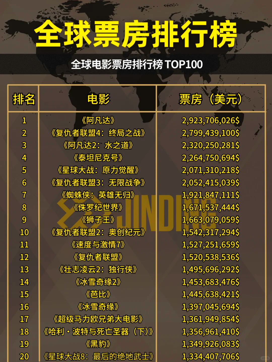 上面的图片就是全球票房排行榜的详细榜单了,我看了大部分的电影,如果不好看的话,也不会得那么高的票房的。